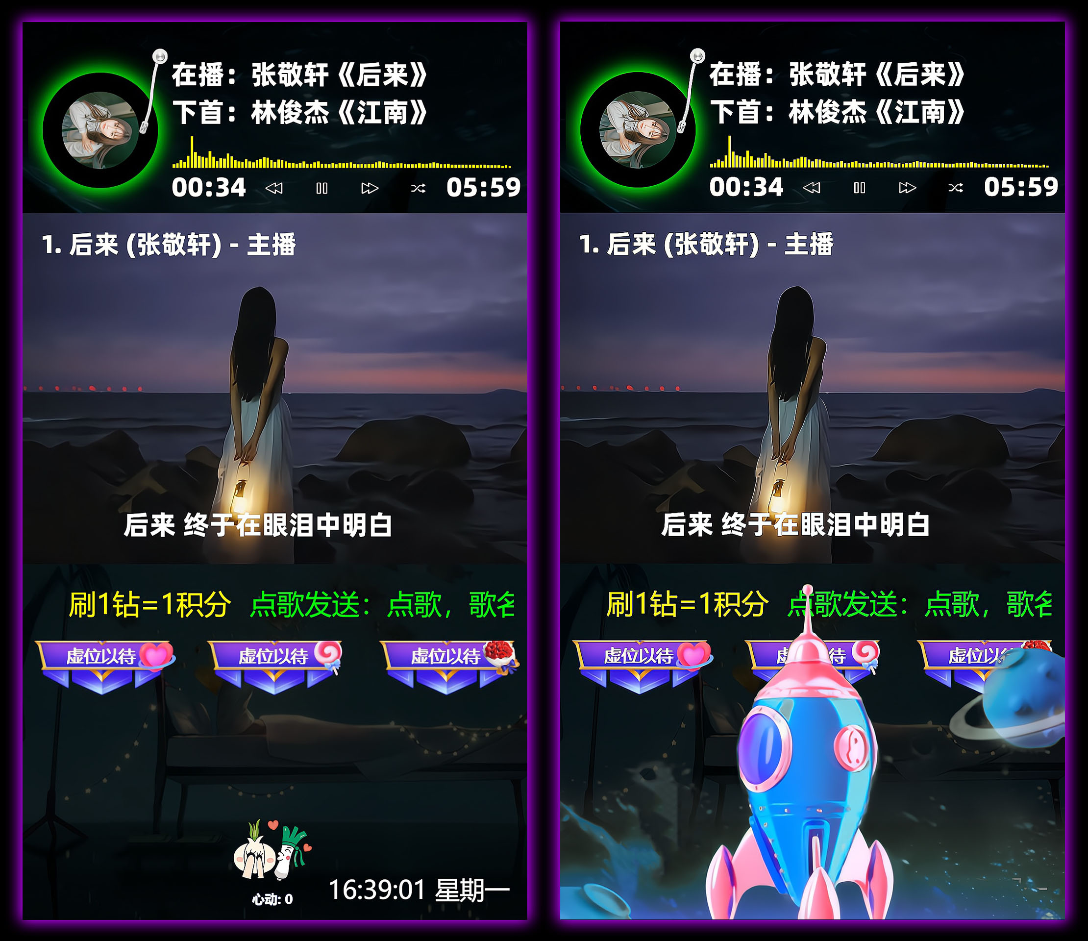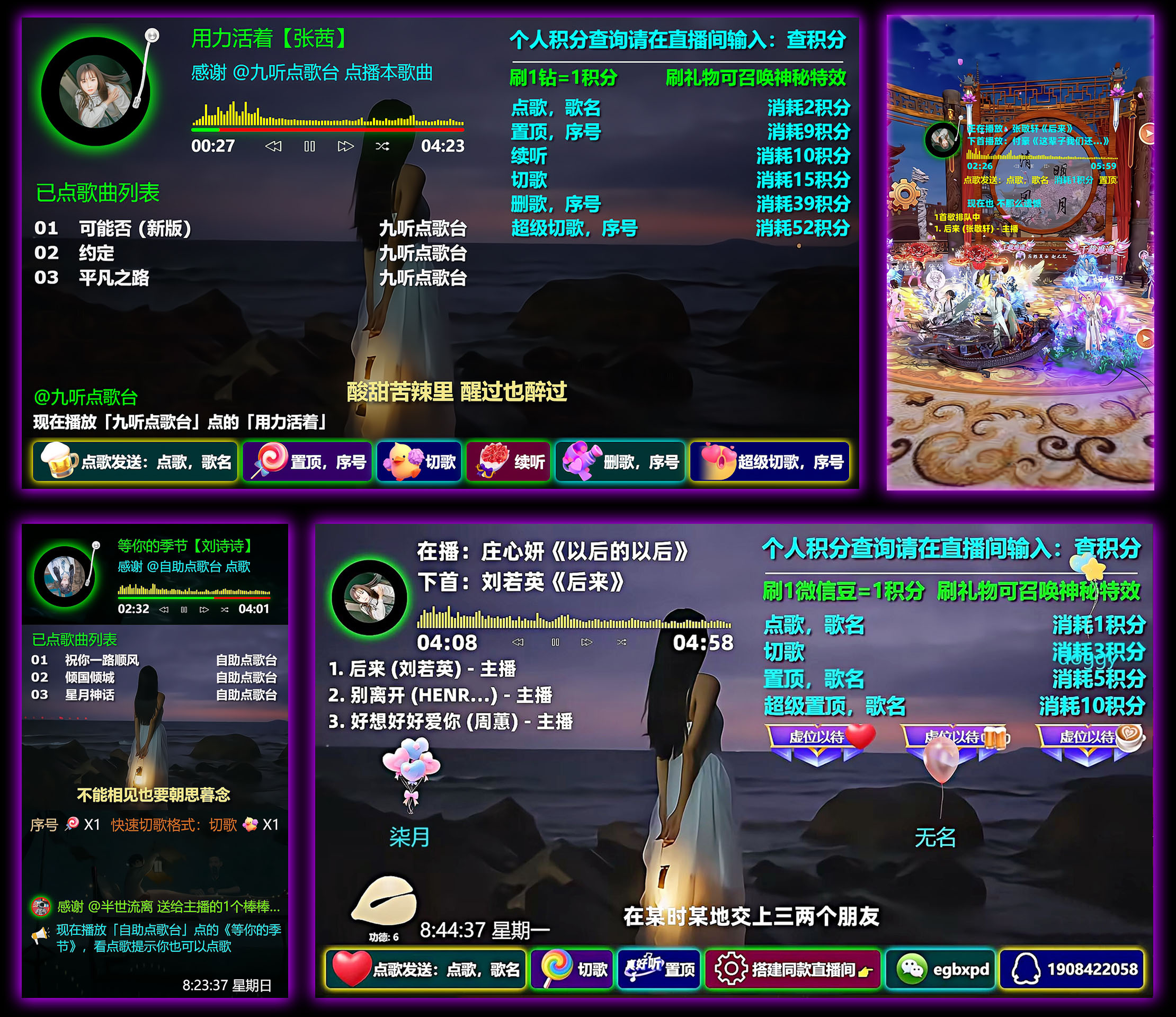 支持功能:支持礼物或者积分点歌、置顶、切歌、续听、删歌、超级切歌,支持语音播报、文字弹幕播报,支持冷场讲解、礼物感谢、关注感谢、点赞感谢、直播间进人欢迎、关键词自动回复,支持deepseek、阿里云、腾讯云等多个大语言模型智能回复,支持普通用户组、粉丝团用户组、VIP用户组、管理员用户组独立自定义积分,支持横版、竖版、七宫格、九宫格、十宫格模板布局,支持阿里云、腾讯云、百度云三大语音接口,支持几百种男生女生普通话及方言发音模型,支持刷任何礼物召唤火箭、嘉年华、天空之城、宇宙之星、璀璨花海、秘境巡游、十里桃花等绝版震撼唯美特效、支持木鱼计数、音播特效、头像飘屏、贵宾席位